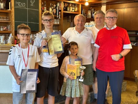 Foto v.l.n.r.: Samuel Molnar (Geteilter 2. Platz), Jannis Schwarz, Karolina Hammer, Jugendtrainer Josef Petz, Co-Trainer Rudolf Wallecker, Obmann Michael Luef.