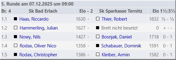 Besonders hervorgehoben sei an dieser Stelle die Top-Leistung von Julian Hammerling: Er erspielte in 6 Runden 5,5 Punkte!