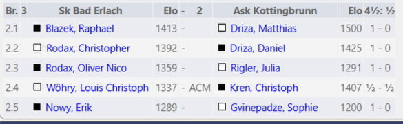In der Jugendliga sorgte unser jüngster Meisterschafts-Spieler Raphael Blazek für den einzigen Bad Erlacher Sieg! Am Spitzenbrett hielt Christopher Rodax die Partie remis, ebenso wie sein Bruder Oliver auf Brett 5.