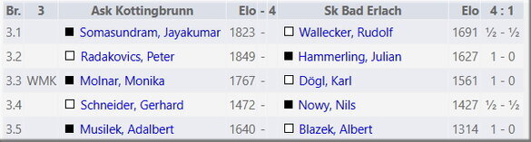 Insgesamt war gegen die nominell sehr stark aufgestellten Kottingbrunner nichts zu holen, aber neben dem Remis von Ing. Manfred Kraus am Spitzenbrett siegte Christopher Rodax in einer sehr schönen Partie gegen WMK Monika Molnar - siehe HIER !